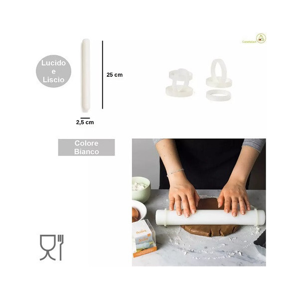 Nel kit è presente un mattarello piccolo in nylon o rullo liscio, antiaderente, colore bianco di lunghezza 25 cm, diametro 2,5 cm