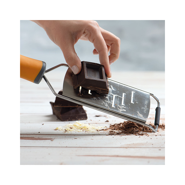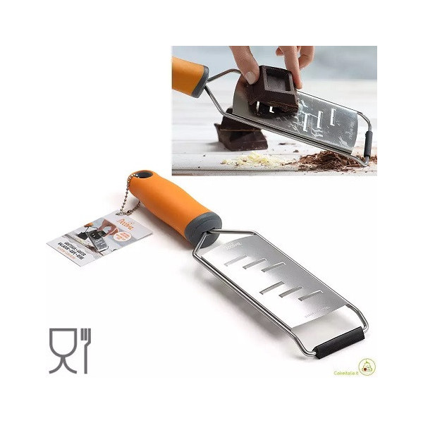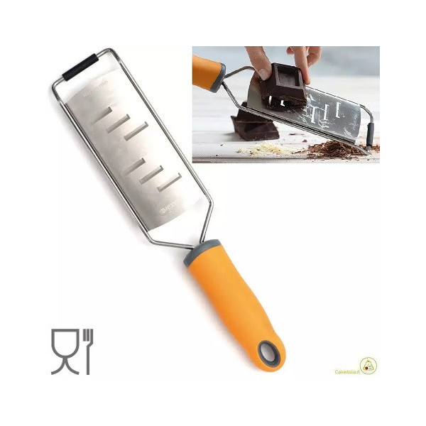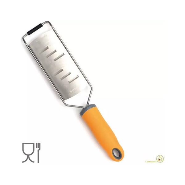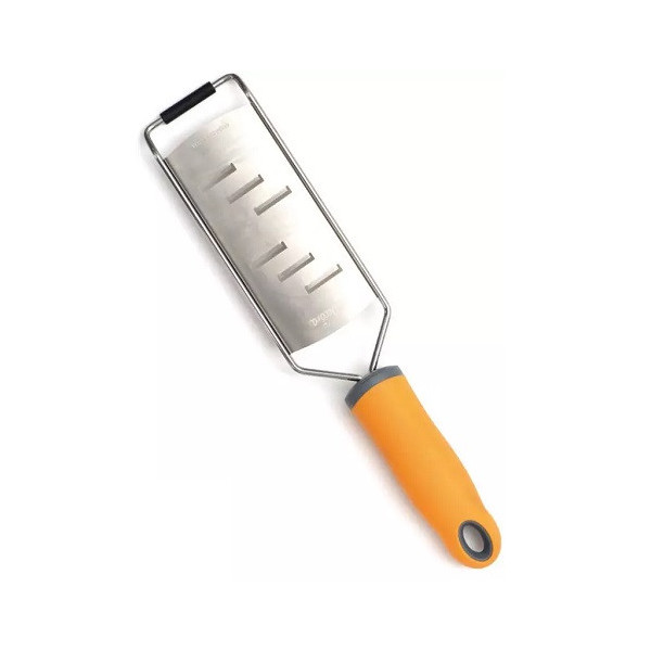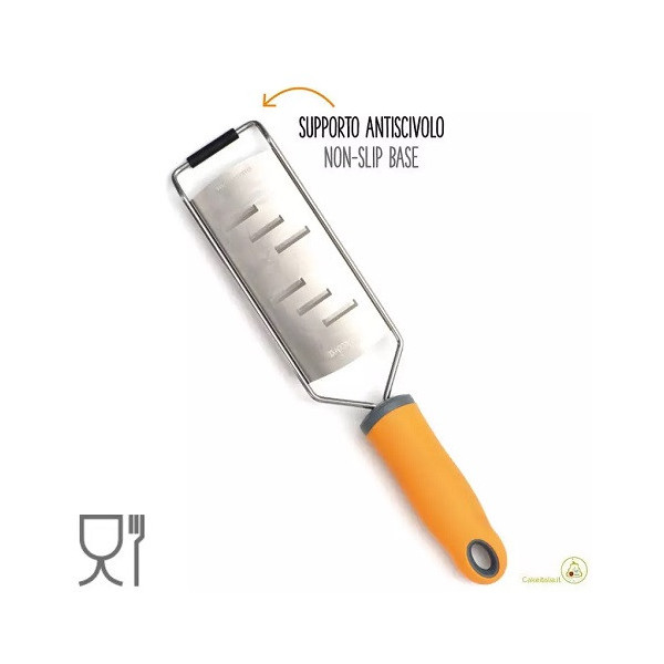 Grattugia ampia a lama larga in acciaio inox con manico in plastica ideali per le diverse preparazioni, pratica per grattugiare a scaglie larghe, in un batter d’occhio e senza fatica, formaggi a pasta dura, zenzero, spezie, cioccolato, tartufo, così come la scorza degli agrumi.