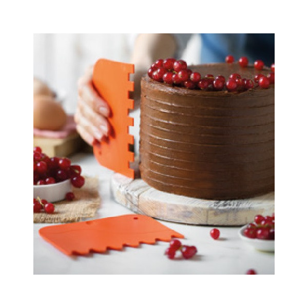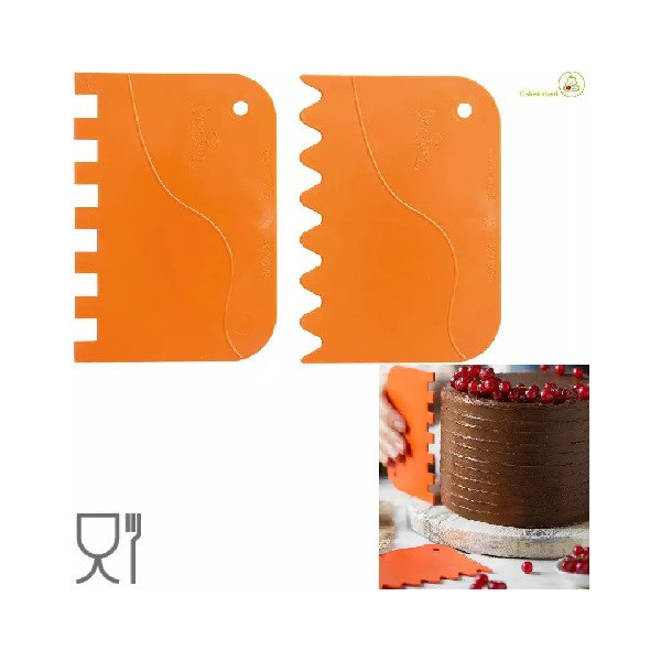 Set 2 tarocchi ondulati a pettine, spatole o raschia multiuso ondulate in plastica arancio da 12 cm x 8,3 cm e da 13,5 cm x 9,2 cm. Indispensabili nella lavorazione di creme, panna e cioccolato..