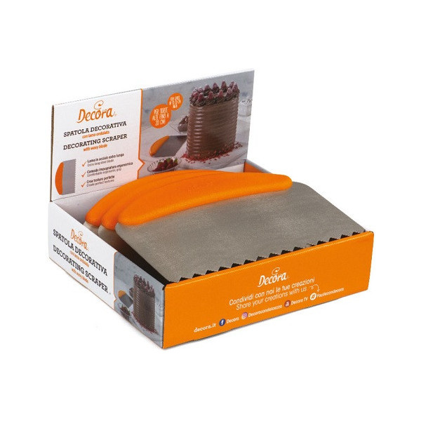 Spatola Decorativa Ondulata da 22,5 x 11 cm: spatola in acciaio inox con manico ergonomico antiscivolo in plastica da Decora, ideale per decorare torte alte.