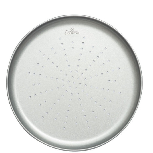 Teglia forata per pizze e focacce croccanti e dalla cottura rapida ed uniforme, di forma tonda e Ø28 o Ø32 cm altezza 1,8 cm in acciaio antiaderente da Decora.