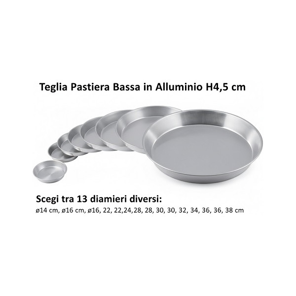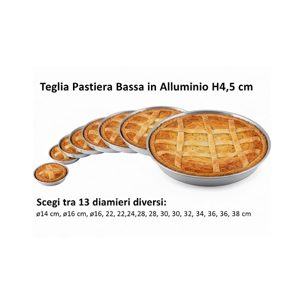 Teglia per pastiera bassa in alluminio al 99,9% per alimenti di misure: diametro 14 cm e 16 cm con altezza 4 cm e dal diametro 18 cm e 36 cm di altezza 4,5 cm