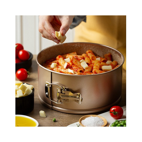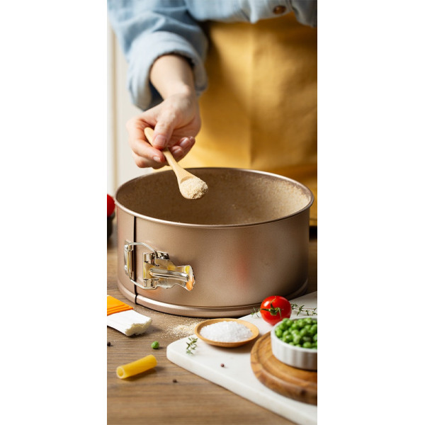 Stampo in metallo antiaderente a cerniera, tortiera apribile con fondo mobili, per preparazioni dolci o salate.