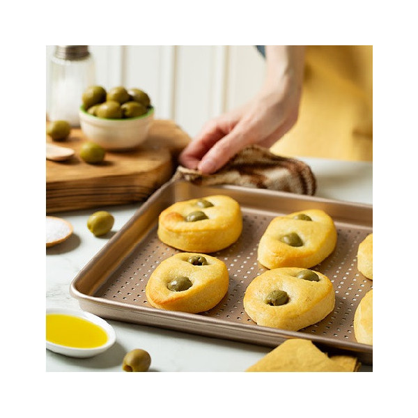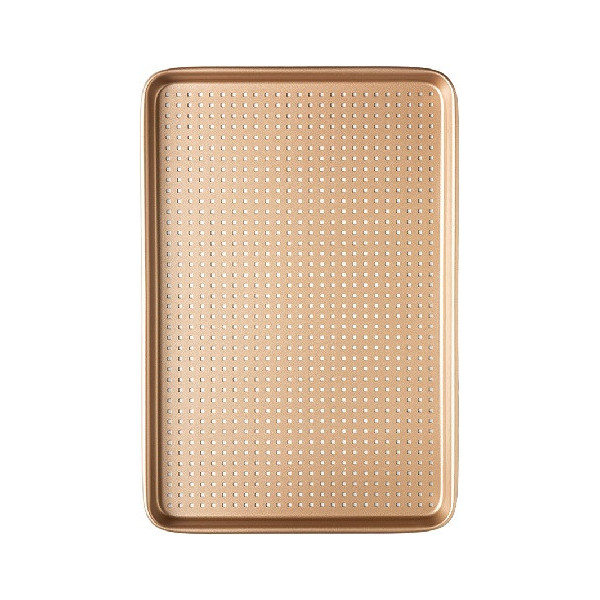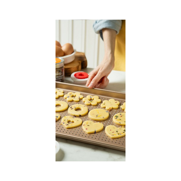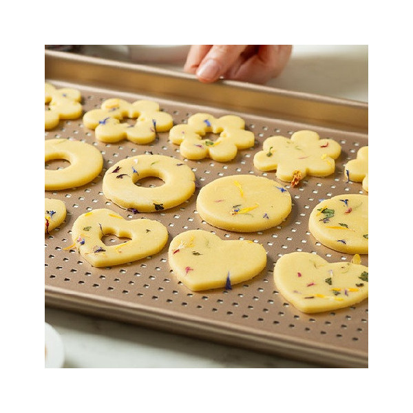 Teglia forata cookies Decora 39,7x27 h 2,4 cm: stampo rettangolare in metallo antiaderente di alta qualità, rose gold line, per uso intensivo e professionale, ideale per biscotti e focaccine.