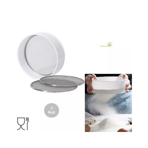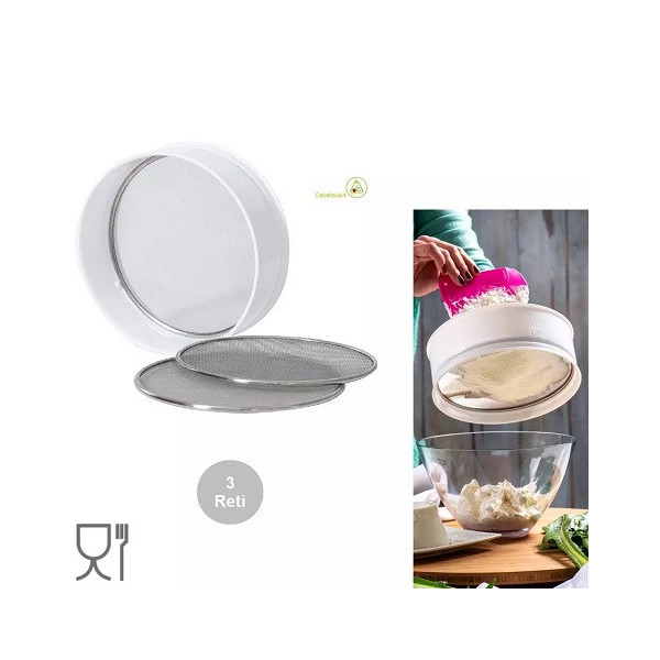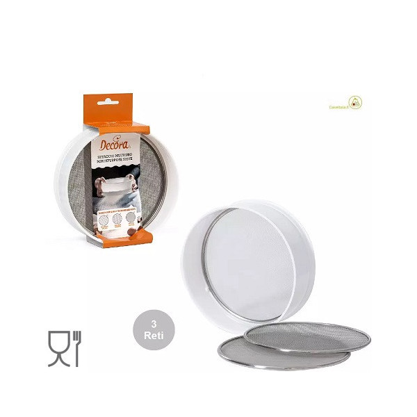 Setaccio multifunzione da Decora con bordo in plastica e 3 reti in acciaio intercambiabili, con maglia: fine, media e grande. Ideale per setacciare farina, purea di frutta, zucchero a velo, polvere, granelle e creme.
