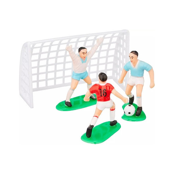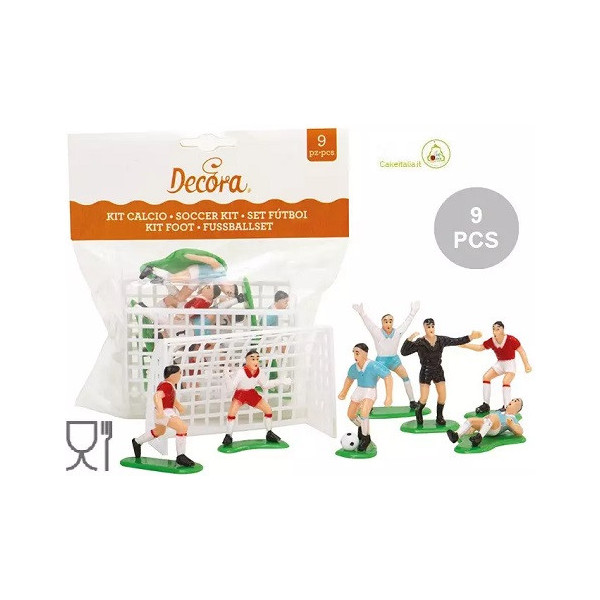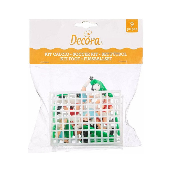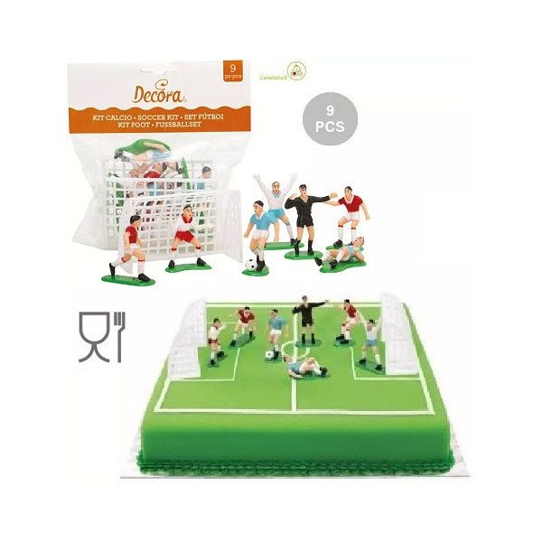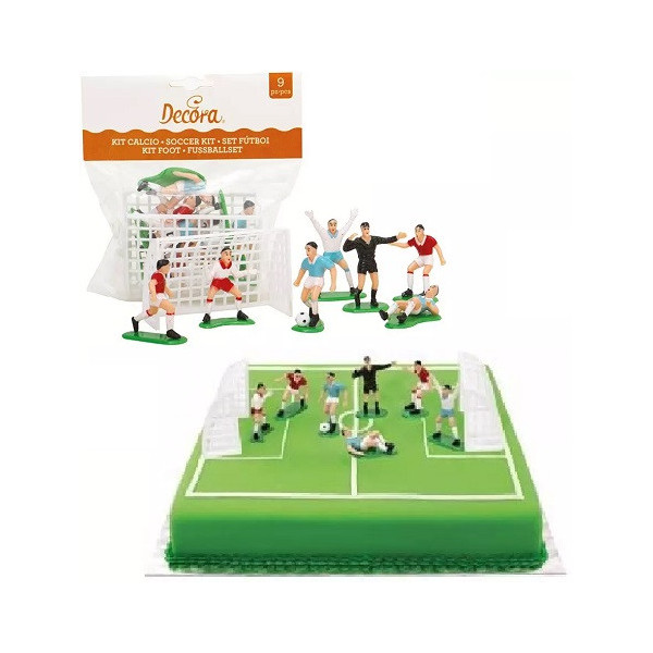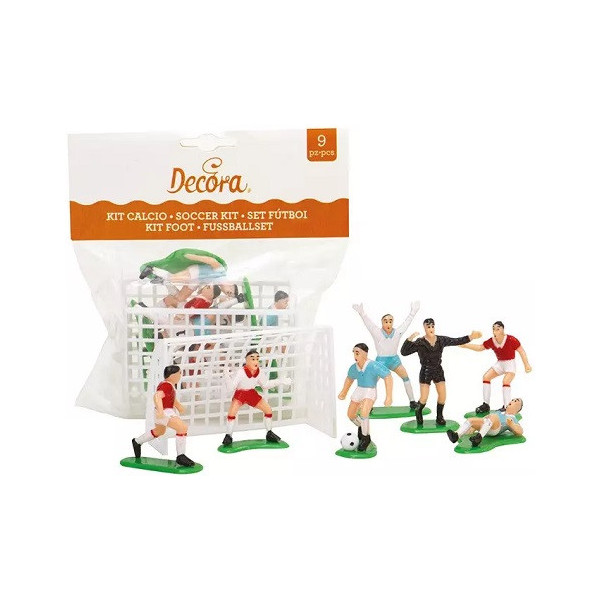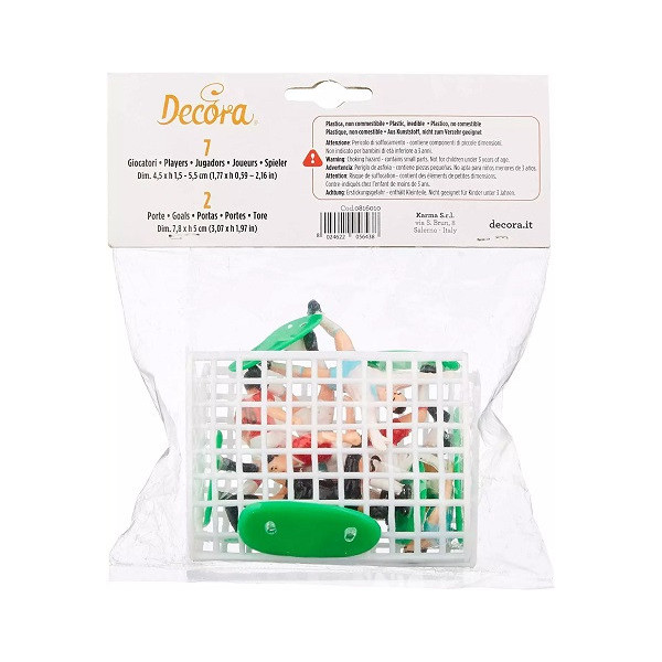 Set per decorazione a tema calcio da Decora: kit con 2 porte larghe 8 cm, alte 5 cm e 7 giocatori, alti da 4,5 cm a 5,5 cm, in plastica idonea per alimenti. Ideale set decorativo a tema calcio perfetto topper per la decorazione di dolci