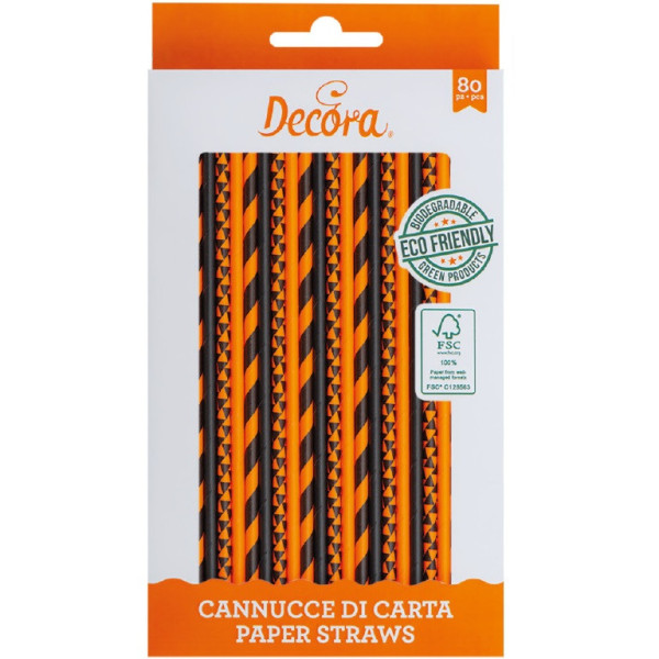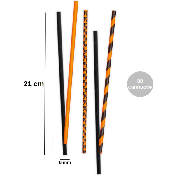 80 Cannucce da 21 cm in carta biodegradabile di colori arancio e nero, ideali addobbare e personalizzare sweet table, feste, party ed eventi a tema, certificate FSC, di Decora.