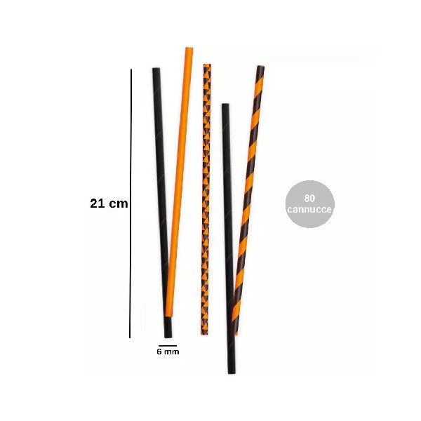 Set da 80 Cannucce da 21 cm in carta biodegradabile ed inchiostro ad acqua, nei colori arancio e nero, ideali per addobbare e personalizzare sweet table, feste, party ed eventi a tema, certificate FSC, di Decora.