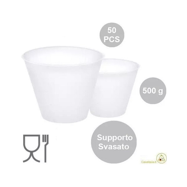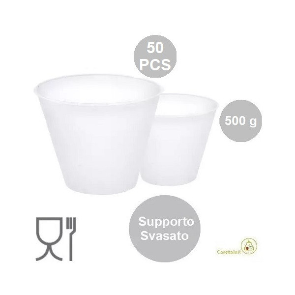 Supporti svasati da 100 g fino a 3 Kg: supporti con bordo superiore leggermente svasato, in plastica semitrasparente, adatta al contatto con alimenti, o basi per uova di pasqua a fazzoletto