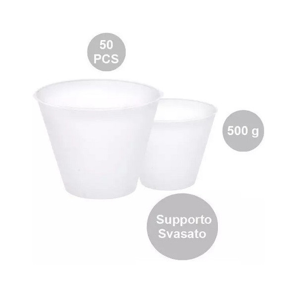 Set 50 supporti con bordo superiore leggermente svasato, in plastica semitrasparente, o basi per uova di pasqua con incarto fazzoletto da 500 g, di misura 128 mm x 71 mm h 104 mm