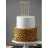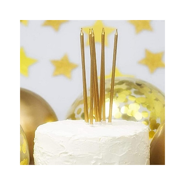Set 12 candele lunghe 14 cm di colore oro, ideale per addobbi e decorazioni di torte e dolci a tema oro.