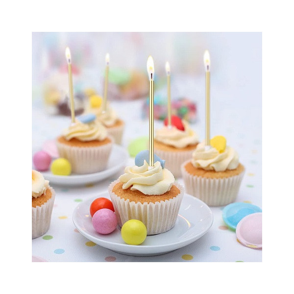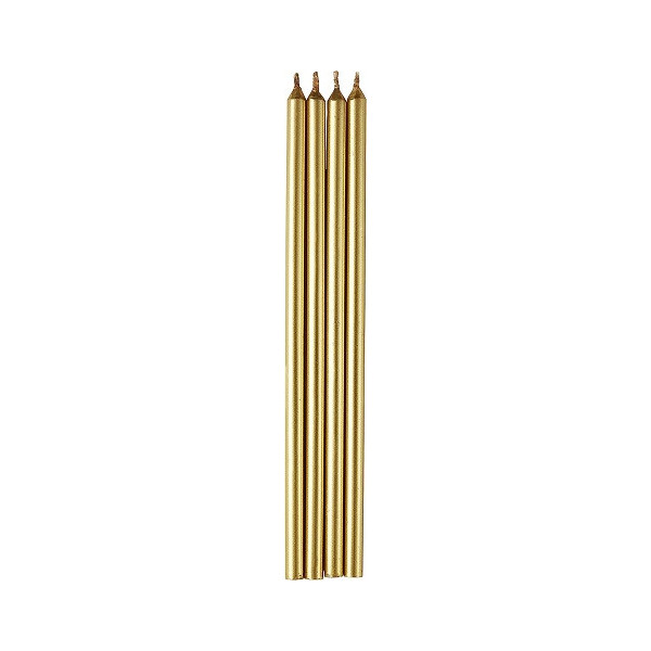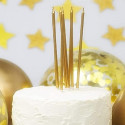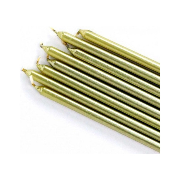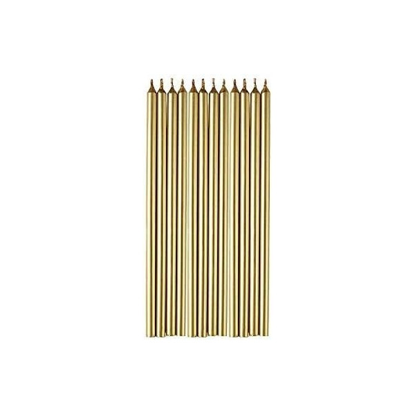 Set 12 candele lunghe 14 cm di colore oro, ideale per addobbi e decorazioni di torte e dolci a tema oro.