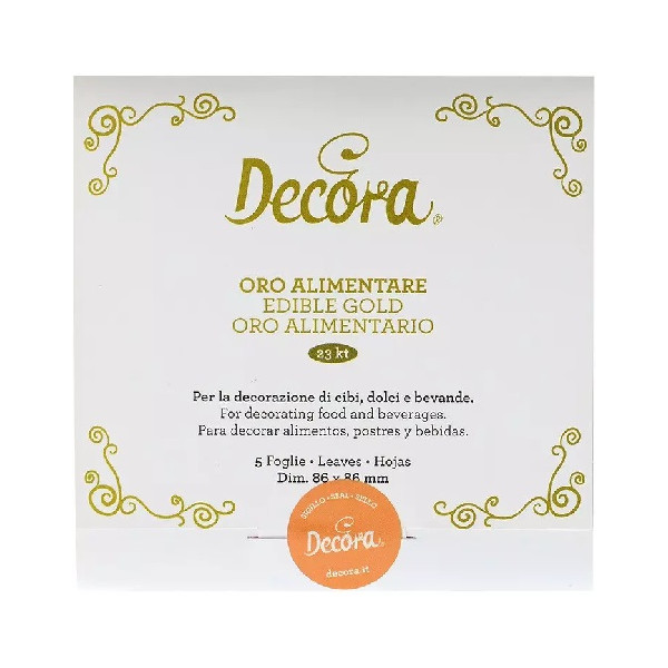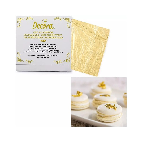 5 Fogli oro alimentare da 23 carati, 0,08 g, dimensione 86 x 86 mm, pronti all'uso, commestibili e dal gusto neutro, da Decora. La foglia d'oro alimentare e ideale per creare preziose decorazioni e dettagli pregiati.