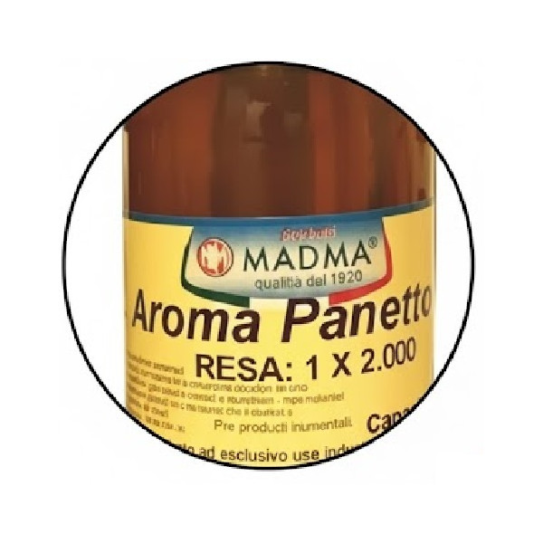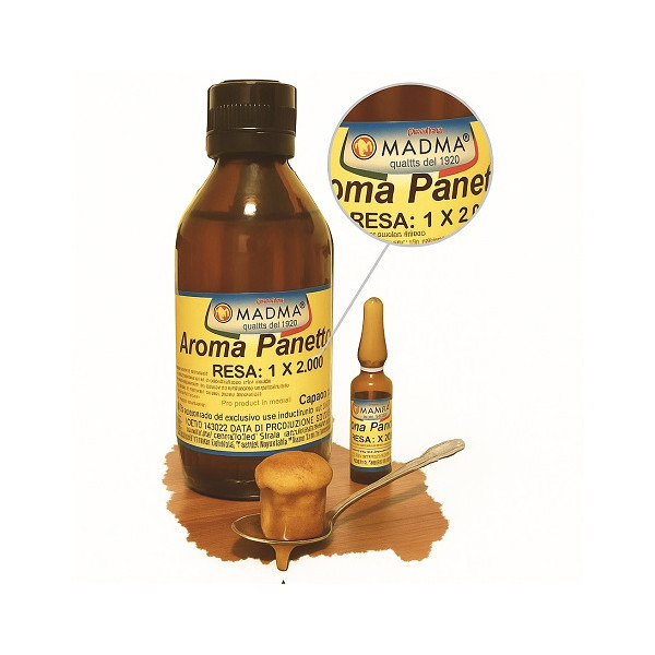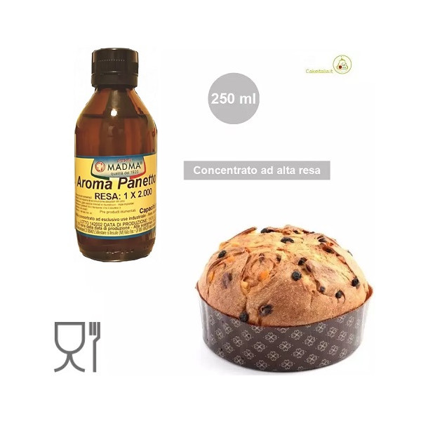 Aroma panettone, liquido, ad alta concentrazione, resa 1:2000, confezionato in flacone da 250 ml, da Madma, è indicato per uso professionale.