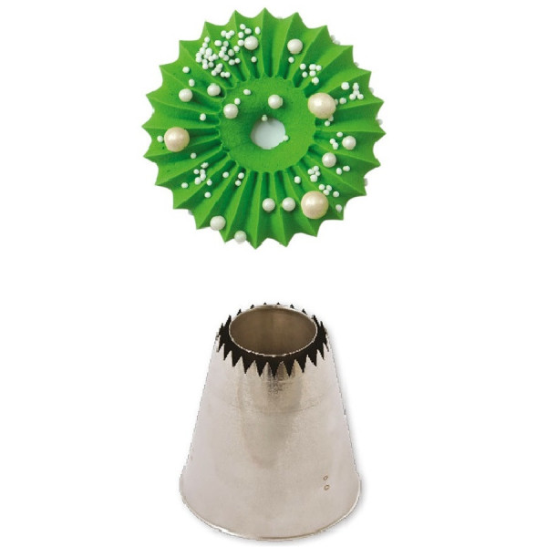 La bocchetta sultane è particolare perché crea una forma con un bordo esterno merlato (o a stella) e un foro al centro. È usata per realizzare decorazioni uniche e precise, ad esempio per: