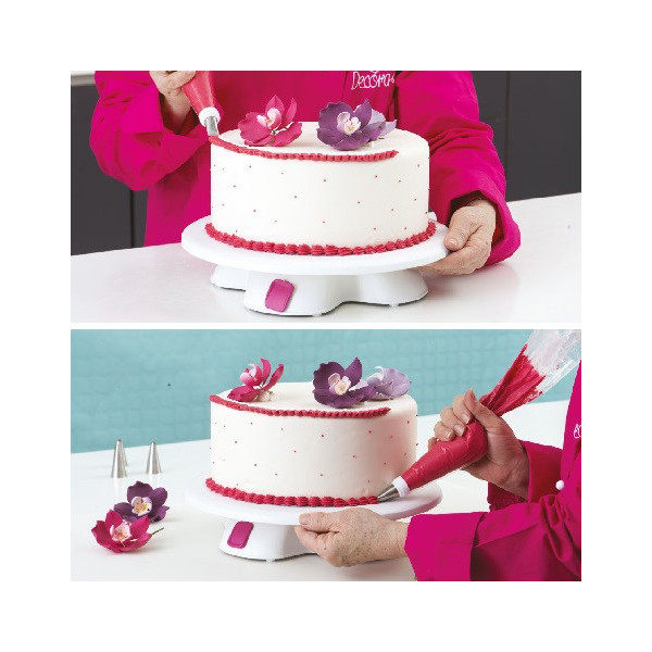 Supporto tondo girevole per torte con ampia superficie d’appoggio e comodi dettagli in gomma che garantiscono una perfetta aderenza al piano di lavoro. Realizzato in materiale plastico di alta qualità, idoneo al contatto con gli alimenti e resistente nel tempo. Il piatto girevole ti permette di decorare, rifinire e rivestire con praticità la tua torta. La base arcuata consente un facile sollevamento e spostamento del dolce. Un pulsante consente di bloccare la rotazione del piatto.