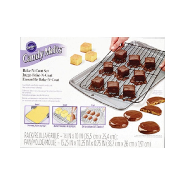 Griglia raffredda torte e colaggio antiaderente con teglia raccoglitore in acciaio argento da Wilton. Griglia antiaderente per cuocere scolare e raffreddare candy melts e cioccolato, per dolci e torte con comoda teglia raccoglitore da Wilton.