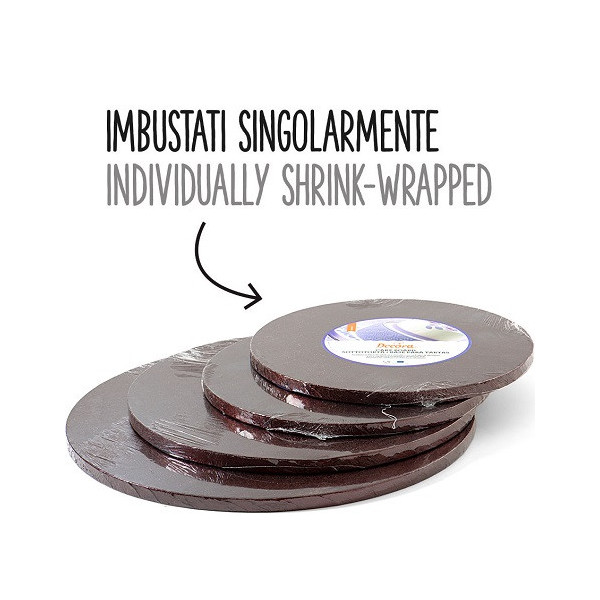 Vassoio tondo marrone, cakeboard marrone, in pasta di cellulosa rigida, con rivestimento in alluminio colorato marrone, adatto al contatto con alimenti, impermeabile, ogni disco o, base per torta è imbustata singolarmente.