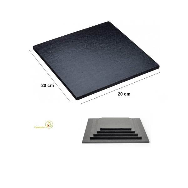 Vassoio sotto-torta quadrato in cartone rigido rivestito con foglio colore nero adatto al contatto con alimenti.