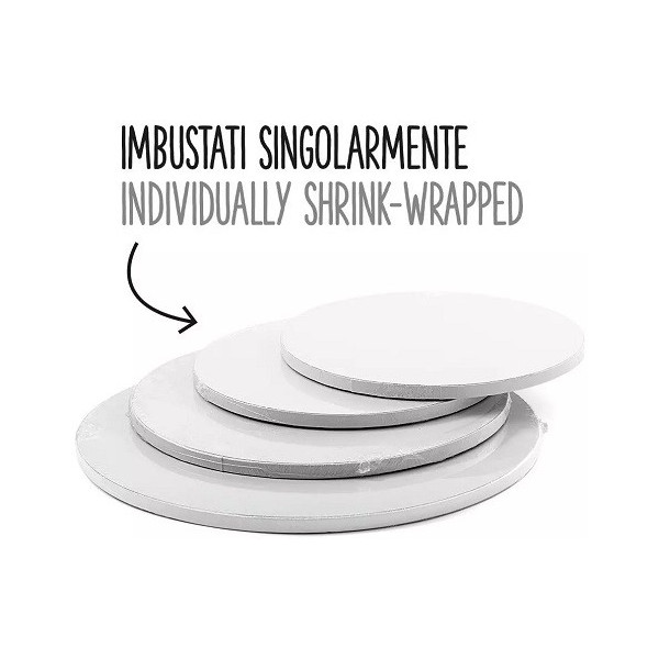 Base o vassoio sottotorta tondo bianco di diametro da ø20 cm a ø45 cm ed altezza 1,2 cm, in pasta di cellulosa rivestite con alluminio colorato per alimenti ed imbustati singolarmente (premium quality).
