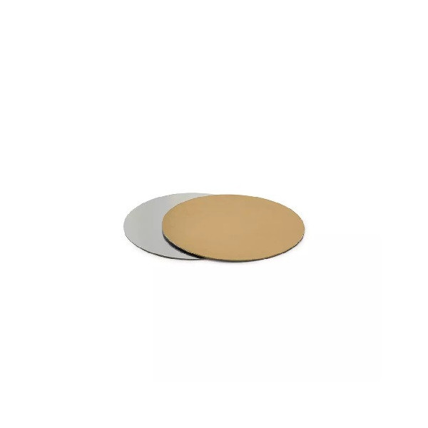 Base per torta tonda, in cartone sottile e rigido, a doppia faccia una in oro e una in argento, incartato singolarmente. Entrambe le fasce sono resistenti, riutilizzabili ed impermeabili grazie alla copertura con pellicola in PET.