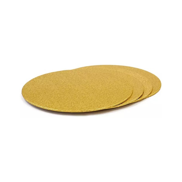 Disco sotto-torta tondo oro, in cartone sottile e rigido, con entrambe le facce ricoperte di una pellicola in PET impermeabile, da diametro 16 cm a 36 cm, spessore 3 mm ed incartati.