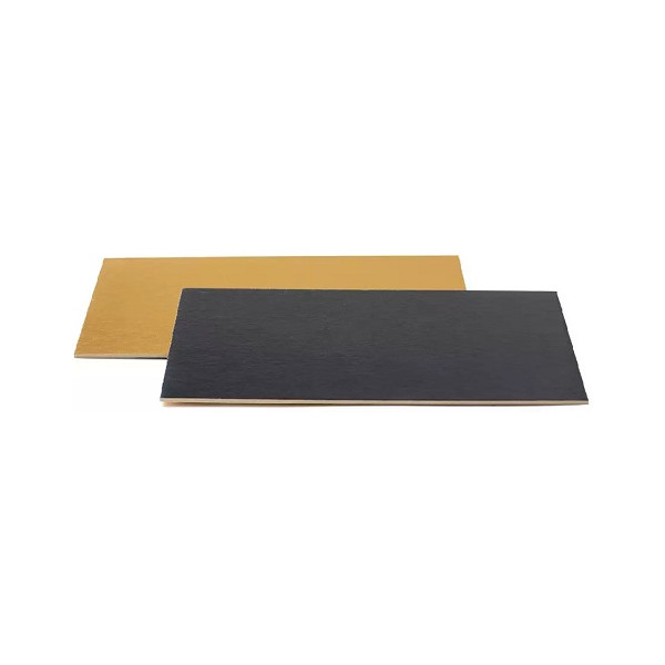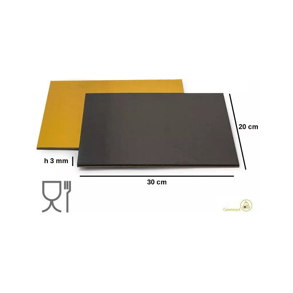 Sottotorta Rettangolare Accoppiato Oro e Nero dimensioni 20x30 cm, spessore 3 mm da Decora: cartoncino sottile e rigido, con entrambe le facce ricoperte di una pellicola in PET impermeabile,