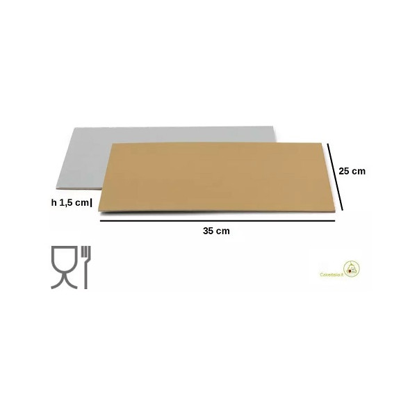Vassoio Sottotorta Rettangolare Accoppiato Oro e Argento da Decora: cartoncino rigido, con entrambe le facce ricoperte di una pellicola in PET impermeabile, da 25 cm a 40 cm e spessore 1,5 mm