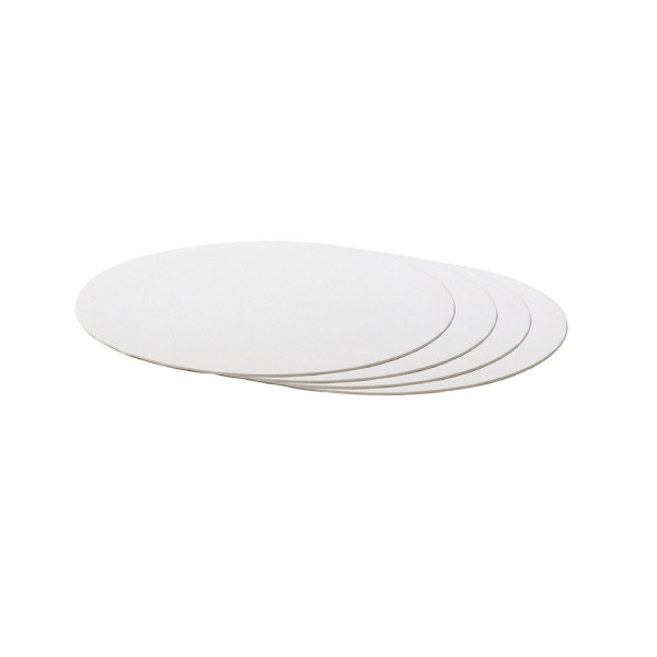 Disco sotto-torta tondo bianco, in cartone sottile e rigido, con entrambe le facce ricoperte di una pellicola in PET impermeabile, da 16 cm a 36 cm, altezza 3 mm ed incartati.