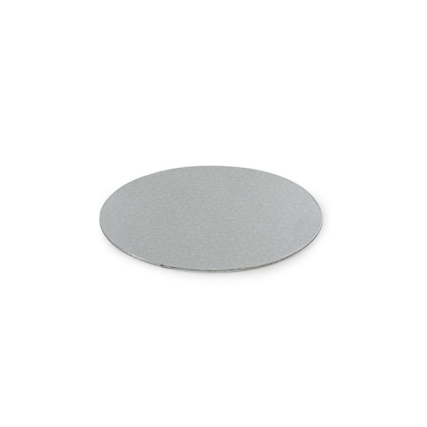 Disco Sottotorta Tondo Argentato da Ø16 a Ø36 cm e spessore 3 mm, in cartone sottile e rigido, incartato, con entrambe le facce ricoperte di una pellicola in PET impermeabile.