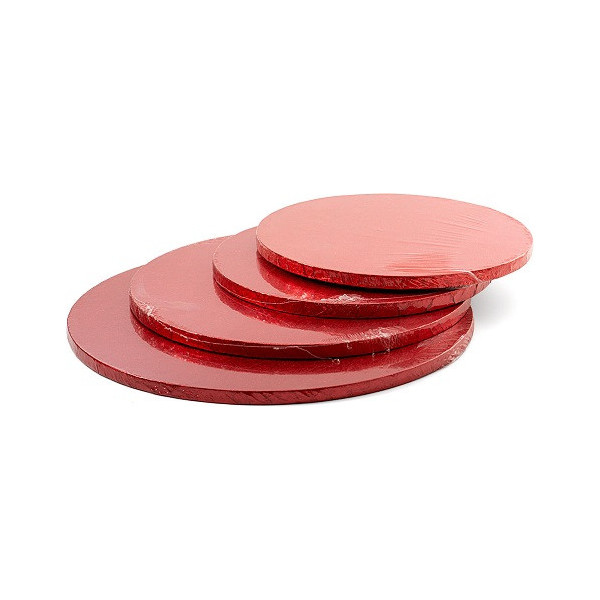 Base o vassoio sottotorta tondo rosso di lato da 20 cm a 40 cm ed altezza 1,2 cm, in pasta di cellulosa rivestite con alluminio colorato per alimenti ed imbustati singolarmente.