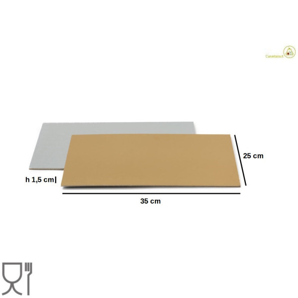 Vassoio sotto-torta rettangolare accoppiato oro e argento, in cartone sottile e rigido, con entrambe le facce ricoperte di una pellicola in PET impermeabile, da 25 cm a 40 cm, alto 1,5 mm