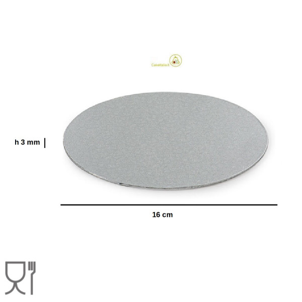 Disco sotto-torta tondo argentato da 16 cm a 36 cm ed altezza 3 mm, in cartone sottile e rigido, incartato, con entrambe le facce ricoperte di una pellicola in PET impermeabile.