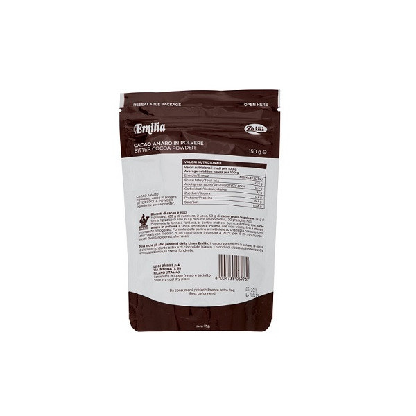 Cacao amaro in polvere Emilia in busta da 150 g o 1 Kg da Zàini. Polvere di cacao per uso professionale, ideale in impasti, liquori, decorazioni, guarniture, ripieni.