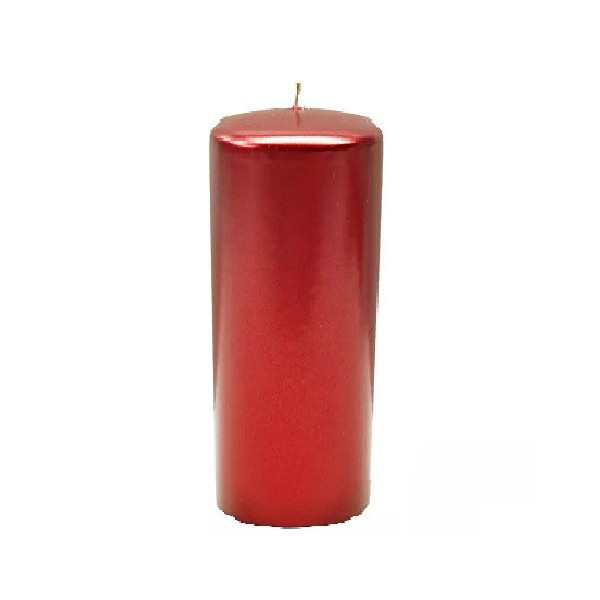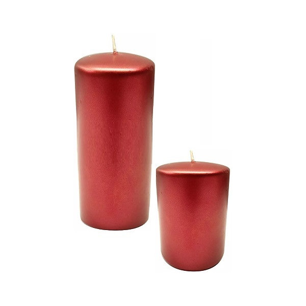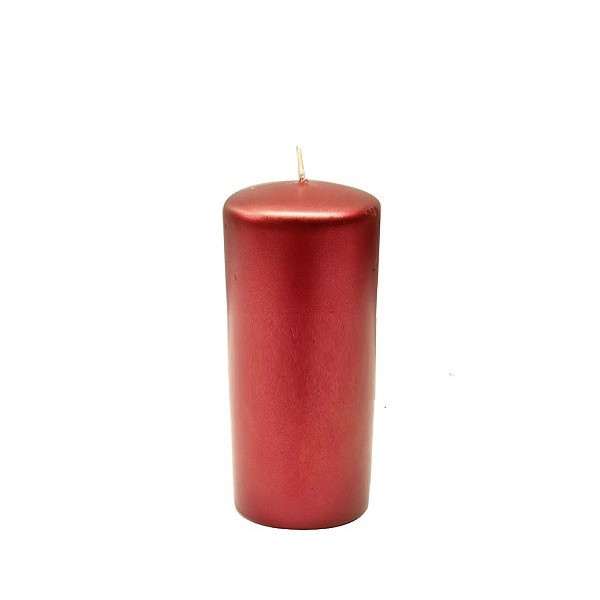 Candela a colonna rosso metallizzato di h10 cm: candela a colonna decorativa di colore rosso metallizzato con stoppino di cotone, tipicamente natalizia, a testa piatta di ø5 e h10 cm.