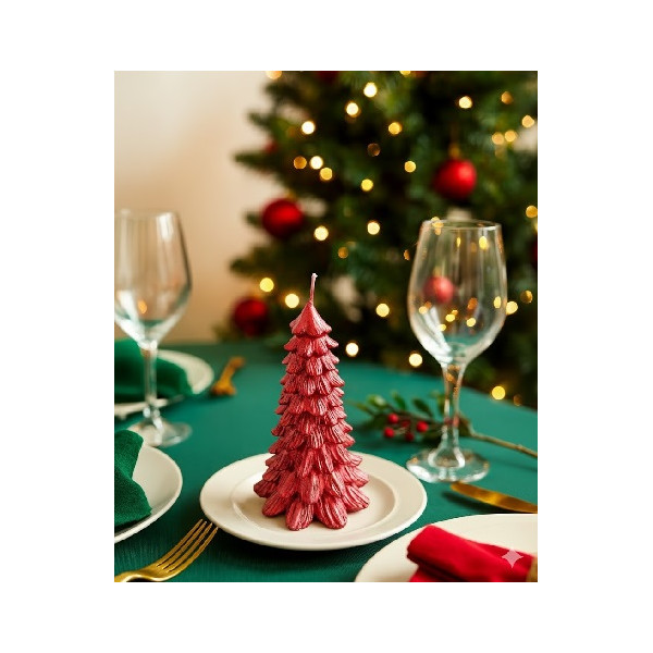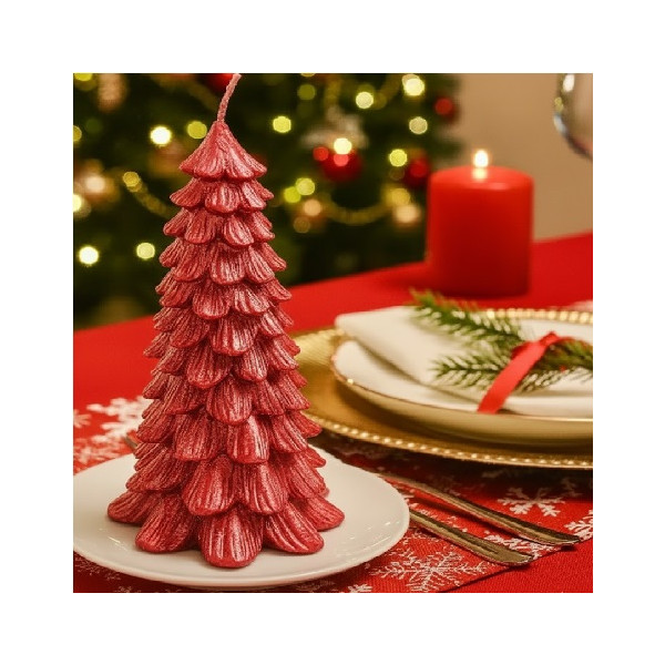 Candela a forma di albero di Natale o Christmas Tree, color rosso metallizzato, di diametro 8,5 cm per altezza 13 cm, ideale per decorare il tuo natale.