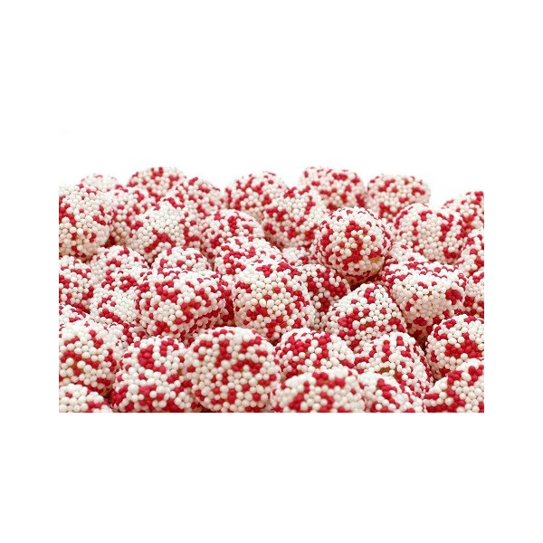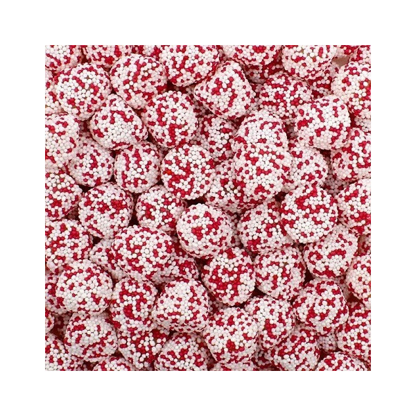 Caramelle gommose a forma di more ricoperte con mompariglia, granella zuccherina, di colore bianco rosse gusto panna e fragola.