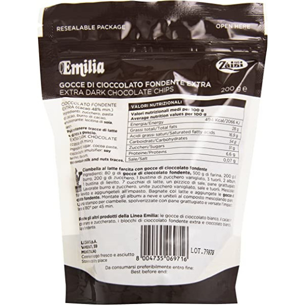 Gocce di cioccolato Emilia fondente extra al 48% di cacao in confezione da 200 g di Zaini. Cioccolato professionale fondente extra in gocce facile da dosare in pasticceria per dolci.