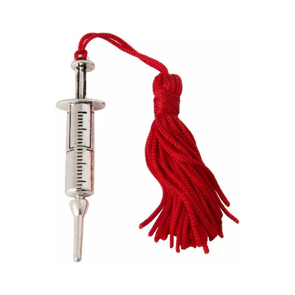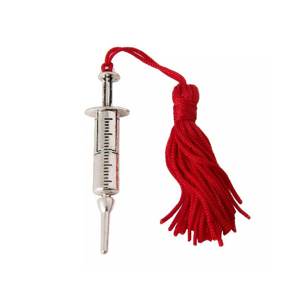 Ciondolo Siringa con Nappina: applicazione in zama a forma di siringa, con nappina rossa, ideale per laurea in medicina