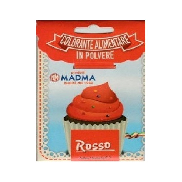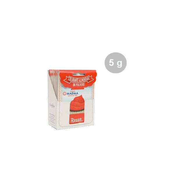 Colorante alimentare in polvere idrosolubile rosso, concentrato, in bustina da 5 g, di Madma. Ideale per colorare pasta di zucchero, ghiaccia, panna e creme.