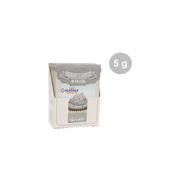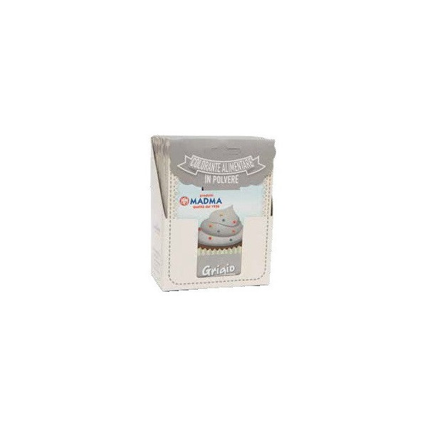 Colorante alimentare in polvere grigio idrosolubile e concentrato in bustina da 5 g, di Madma. Ideale per colorare pasta di zucchero, ghiaccia, panna e creme.