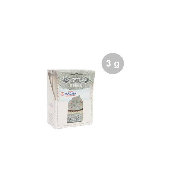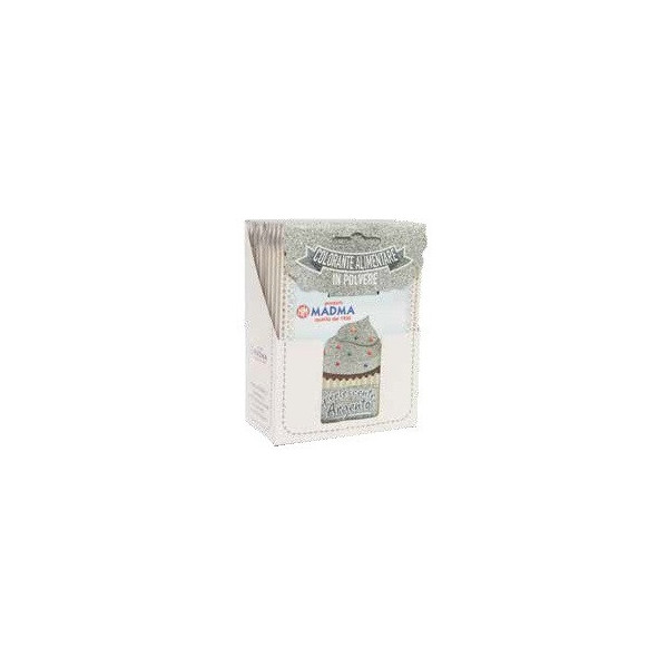 Colorante in polvere Sparkle Argento Puro o brillante o scintillante, idrosolubile e concentrato in bustina da 3 g o barattolo da 8 g, di Madma. Ideale per pasta di zucchero, ghiaccia, panna e creme.