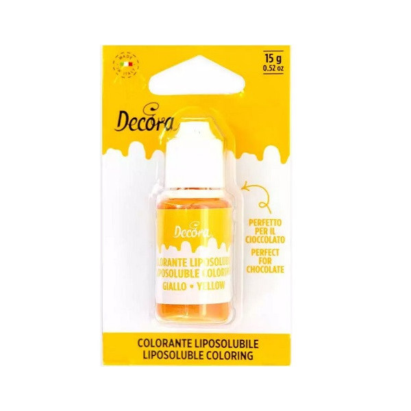 Colorante liposolubile liquido giallo uso alimentare in bottiglia da 15 g di Decora. Particolarmente indicati per colorare il cioccolato o panna e creme al burro,