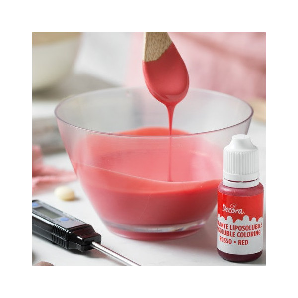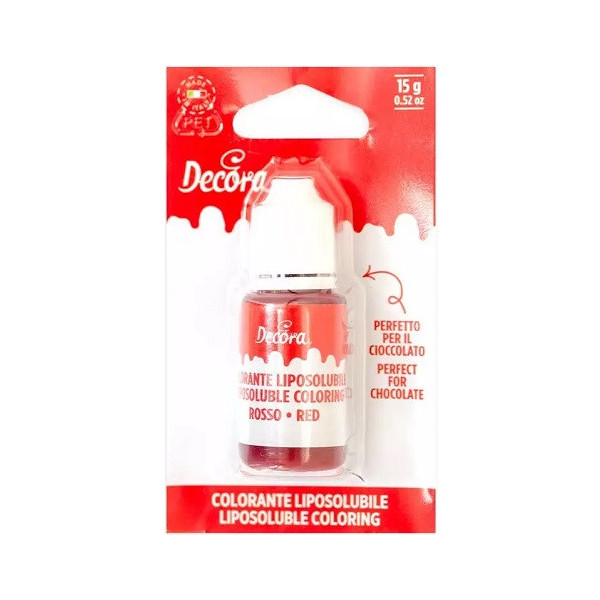 Colorante liposolubile liquido rosso uso alimentare in bottiglia da 15 g di Decora. Particolarmente indicati per colorare il cioccolato o panna e creme al burro,
