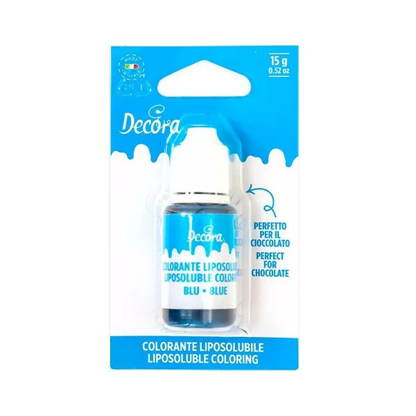 Colorante liposolubile liquido blu uso alimentare in bottiglia da 15 g di Decora. Particolarmente indicati per colorare il cioccolato o panna e creme al burro,