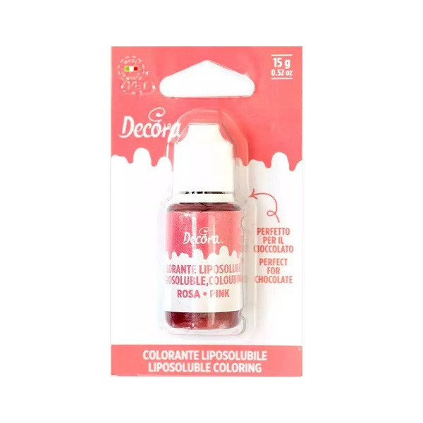 Colorante liposolubile liquido rosa uso alimentare in bottiglia da 15 g di Decora. Particolarmente indicati per colorare il cioccolato o panna e creme al burro,
