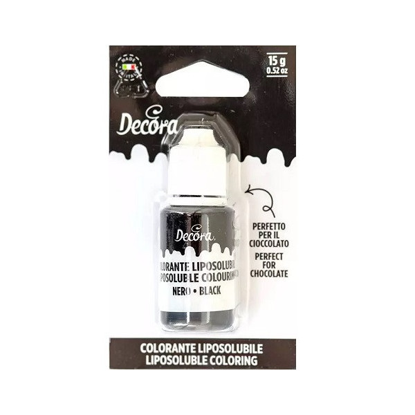 Colorante liposolubile liquido nero, uso alimentare, in bottiglia da 15 g, di Decora. Particolarmente indicati per colorare il cioccolato o panna e creme al burro,