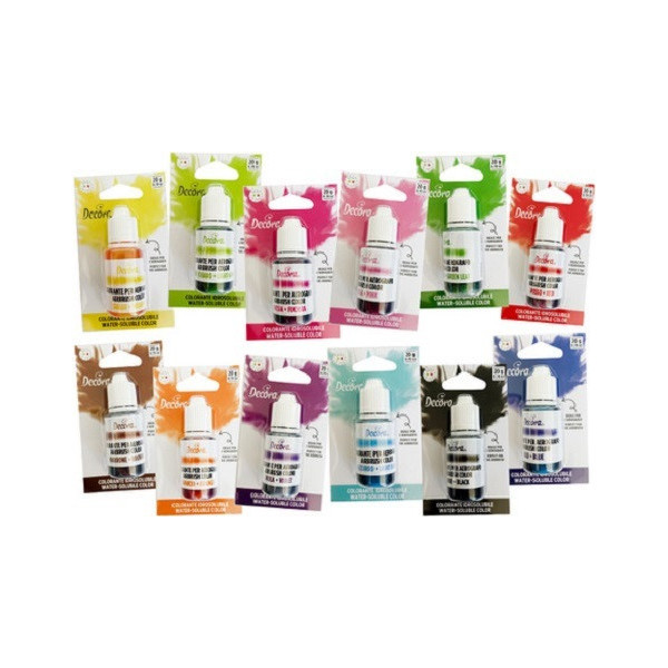 Colorante liposolubile liquido verde uso alimentare in bottiglia da 15 g di Decora. Particolarmente indicati per colorare il cioccolato o panna e creme al burro,