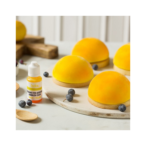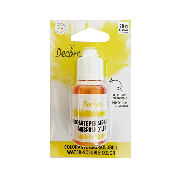 Colorante idrosolubile liquido giallo, ad uso alimentare, in bottiglia da 20 g, di Decora. Ideale per aerografo, per colorare e decorare dolci.