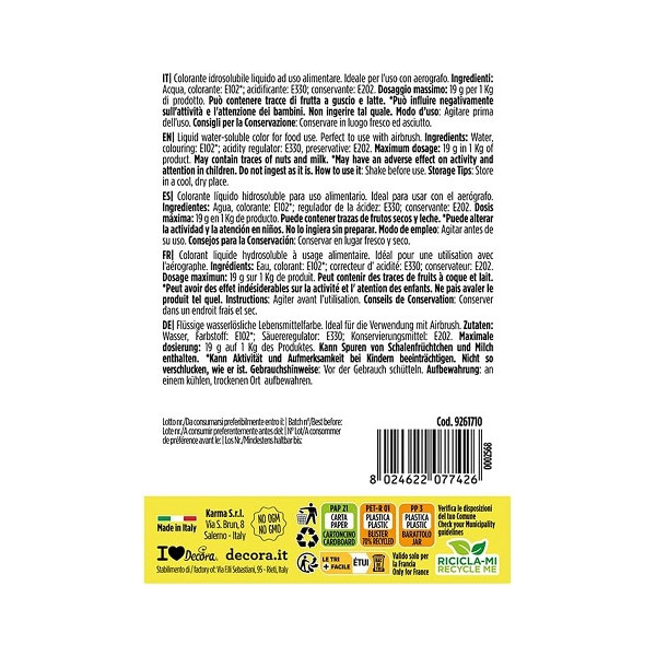 Tipo: colorante idrosolubile liquido per usi alimentari